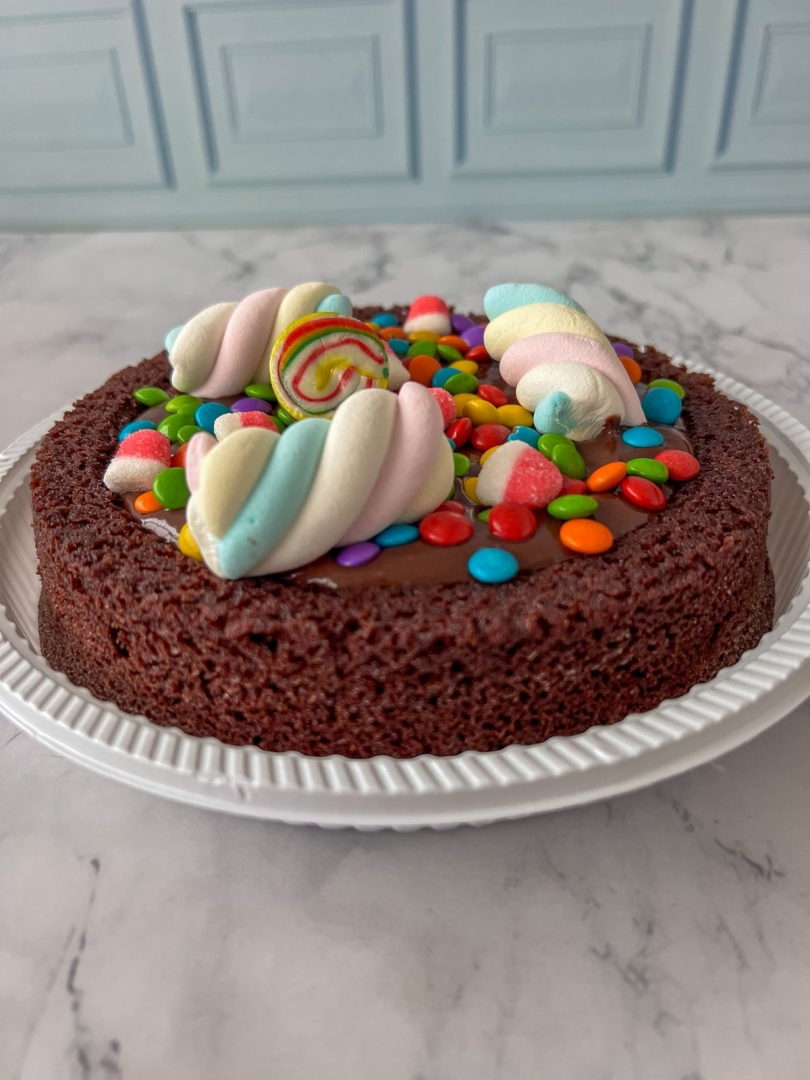 🍫 Uma sobremesa feita para encantar na Semana das Crianças! Massa fofinha de chocolate com brigadeiro cremoso, marshmallow, confete e pirulito — diversão garantida e sorrisos a cada colherada! 🎠✨