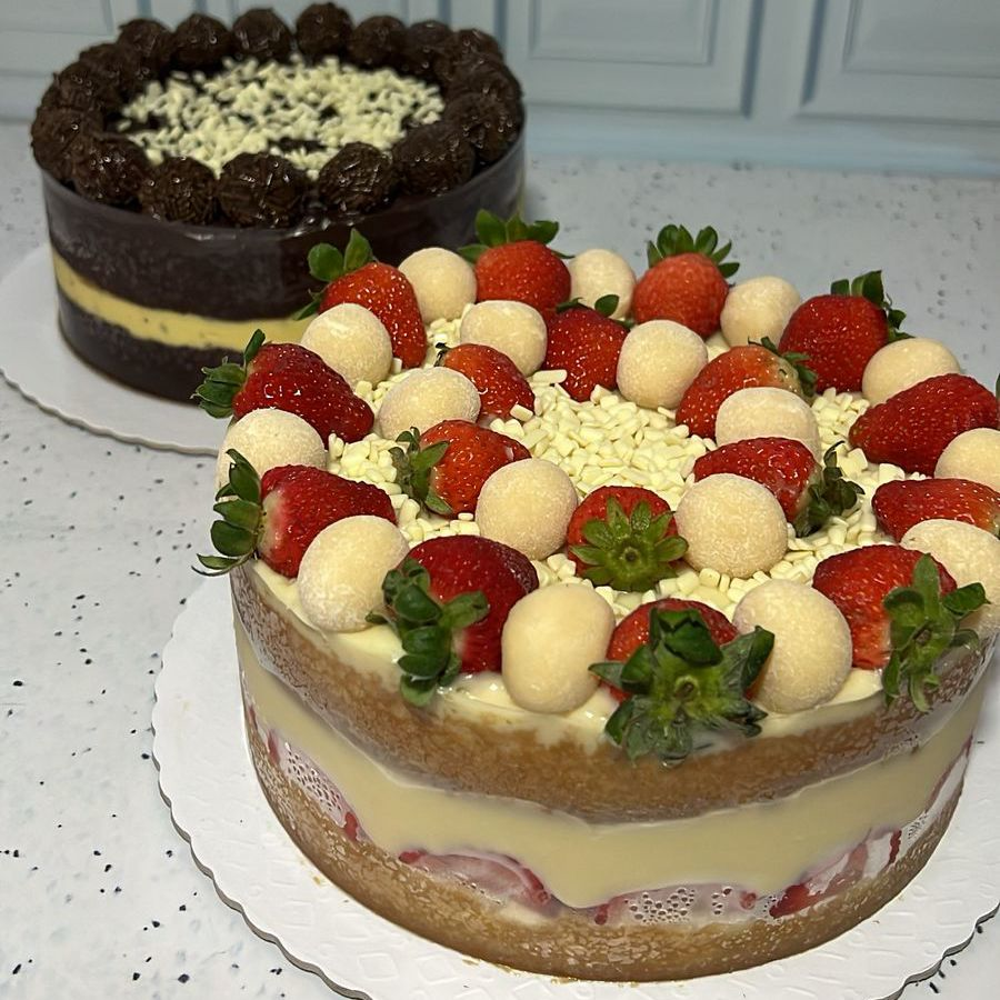 Bolo decorado: massa de chocolate com cobertura (Ninho ou chocolate opcional), morangos e docinhos (brigadeiro e Ninho com Nutella) Serve até 10 a 12 pessoas.
