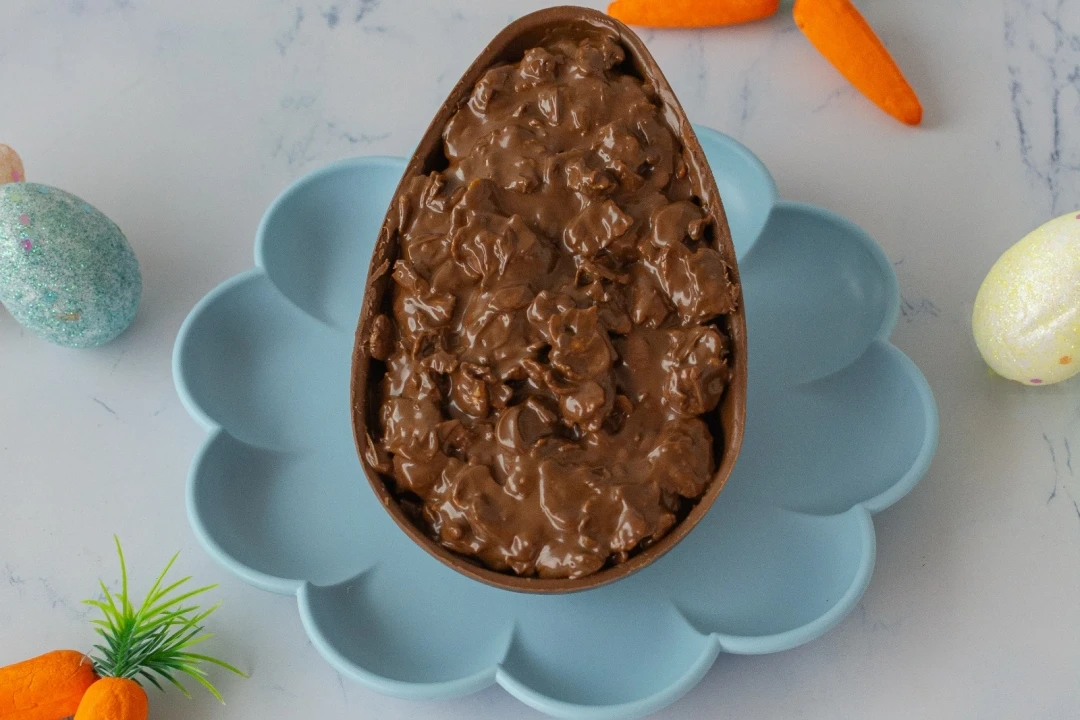 Casca ao leite recheada com um brigadeiro 50% cacau e crocante de nutella . Casca ref 250g. Peso médio 350g. Val 3 dias sob refrigeração
