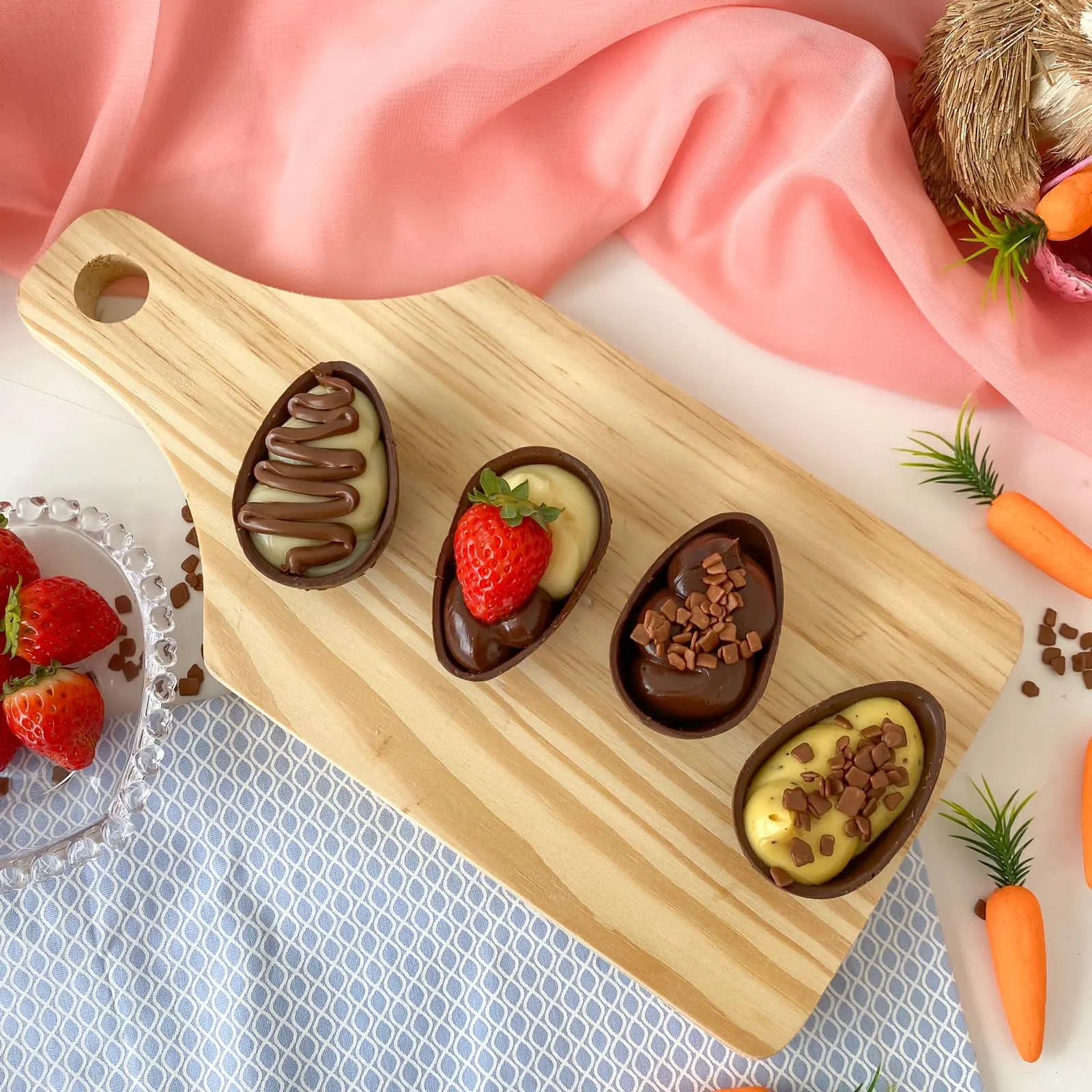 Ele é composto por quatro mini ovos de colher, cada um pesando 40g, perfeitos para uma degustação sublime. O kit inclui sabores irresistíveis: um cremoso de Brigadeiro, famoso encantador Ninho com Nutella, um azedinho de Maracujá e um perfeirto Bombom de Morangos. Este item pré-Páscoa está prontamente disponível para entrega imediata. Infelizmente, não aceitamos encomendas. Uma experiência de sabor inesquecível, criada especialmente para você apreciar a Páscoa de uma maneira única e deliciosa.