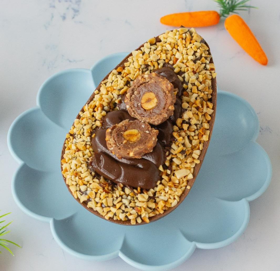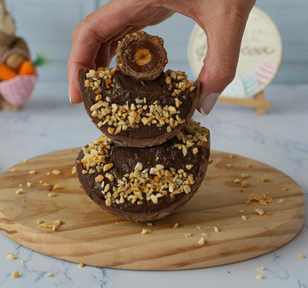 Casca ao leite recheada com um cremoso brigadeiro 50% cacau, coberta com uma generosa camada de Nutella, amendoim e finalizada com bombons de Ferrero Rocher para aquele toque irresistível. Casca ref 250g. Peso médio 350g. Val 3 dias sob refrigeração
