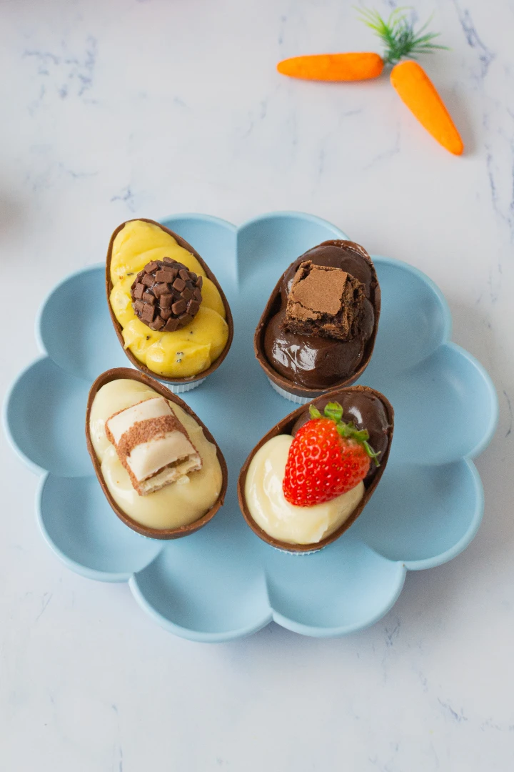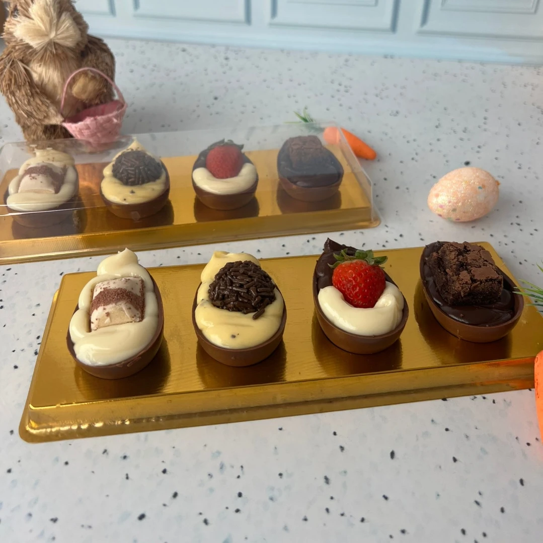 Um lindo kit de presente para aproveitar a páscoa com os melhores brigadeiros. Contém quatro mini ovos de colher 40g cada - Brownie com brigadeiro, Kinder com Nutella, maracujá com brigadeiro e bombom de morango. Enviado em caixa para presente, laço e tag. **validade dias 3 em geladeira.
