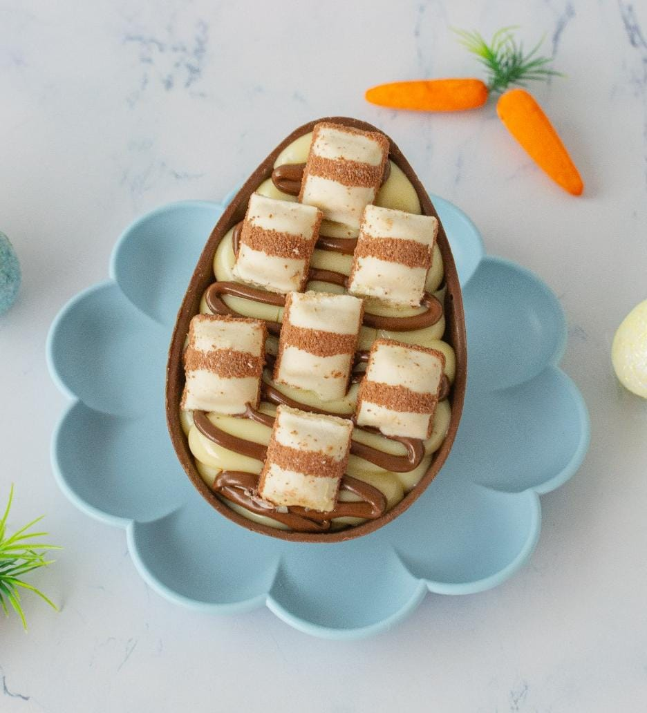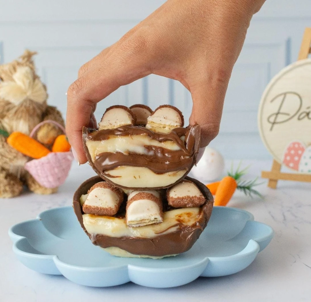 Casca de coelho, duas mangas de recheio: ninho e chocolate. Bolinhas crocantes, marshmallow e confete.