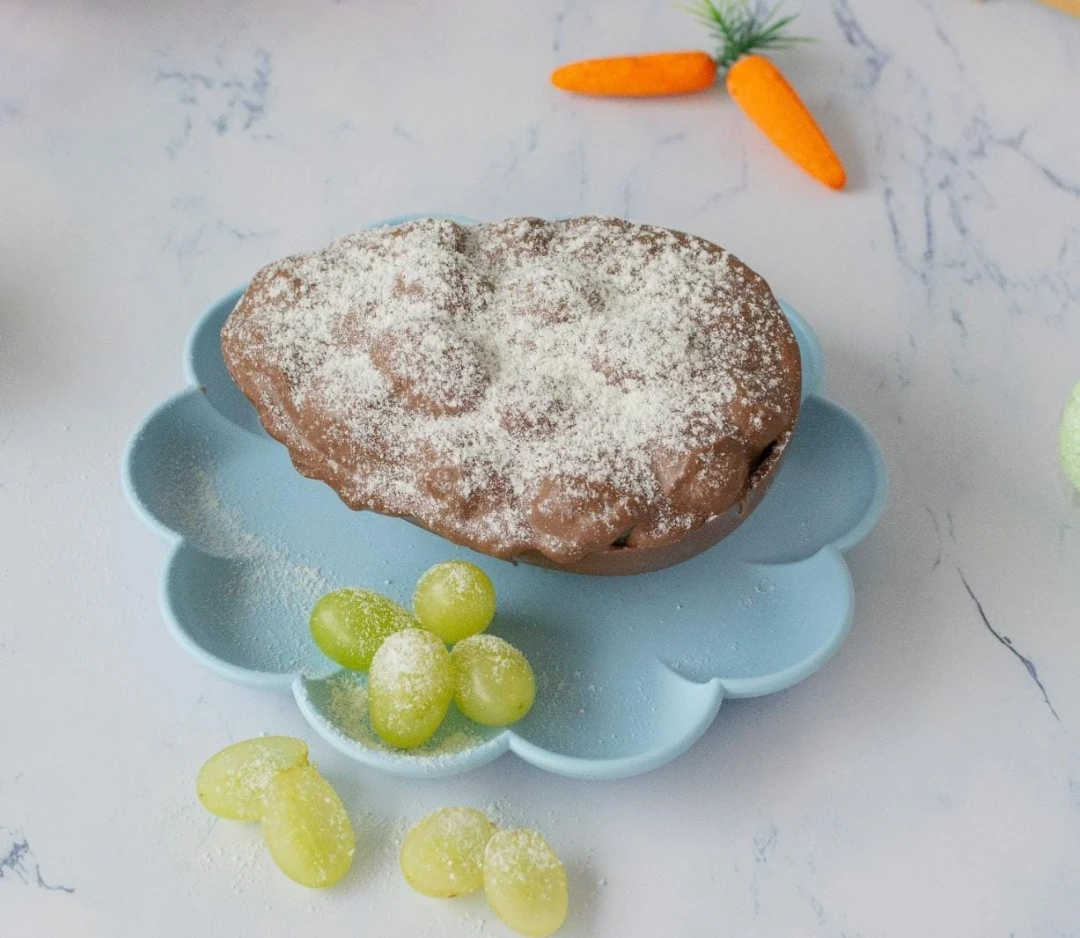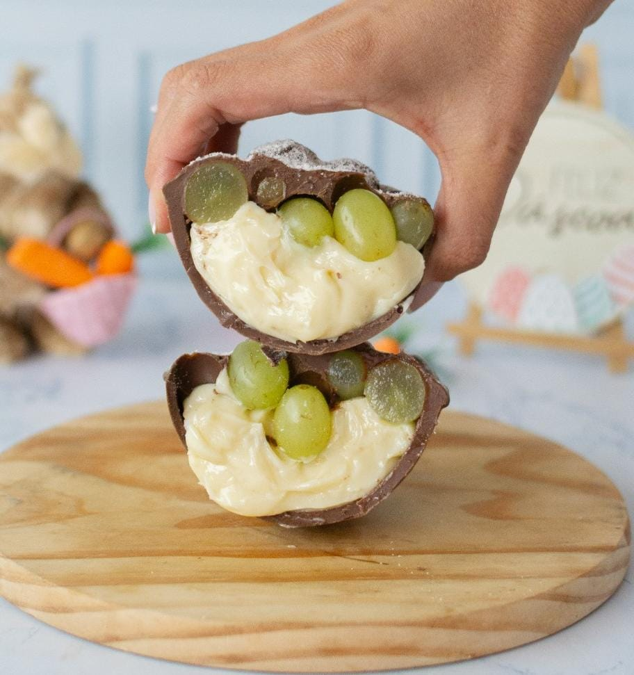 Casca ao leite recheada com um cremoso brigadeiro de ninho e uvas. Casca ref 250g. Peso médio 350g. Consumo imediato por conta da fruta.