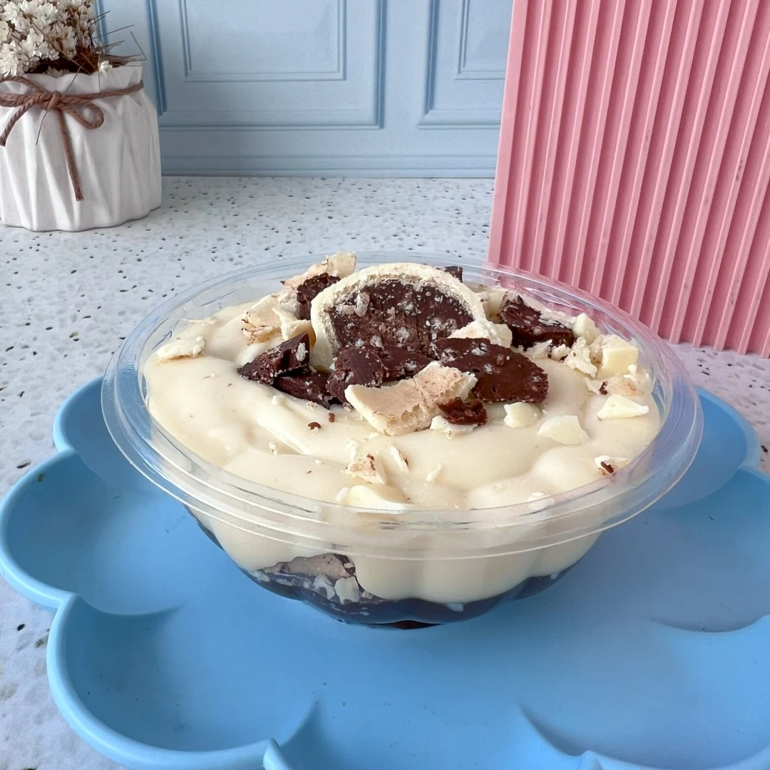 Pavê de Ouro branco com camadas de brigadeiro branco, brigadeiro 50% cacau e bombons picados. Uma combinação cremosa, intensa e crocante que equilibra o doce na medida certa.